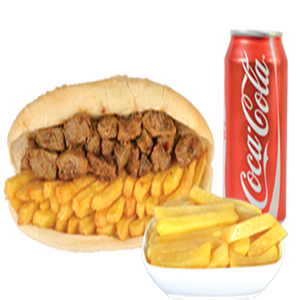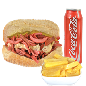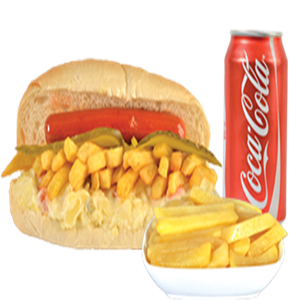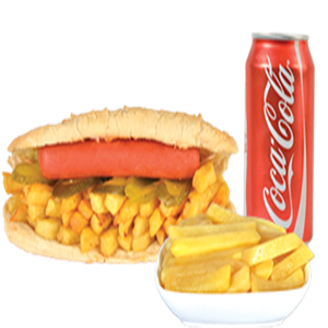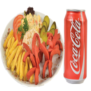 Uzun kızarmış Sosis, Kızarmış Patates, Garnitür,Akdeniz yeşillik + Cola