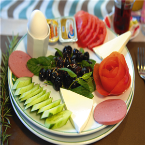 Bal, Tereyağı, Zeytin, Beyaz Peynir, Kaşar peyniri, Salam, Yumurta, Domates, Salatalık, Karper Peynir,Patetes